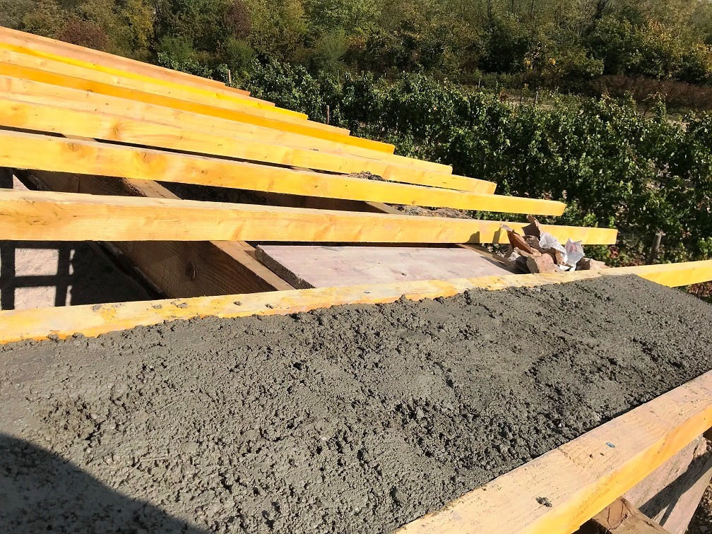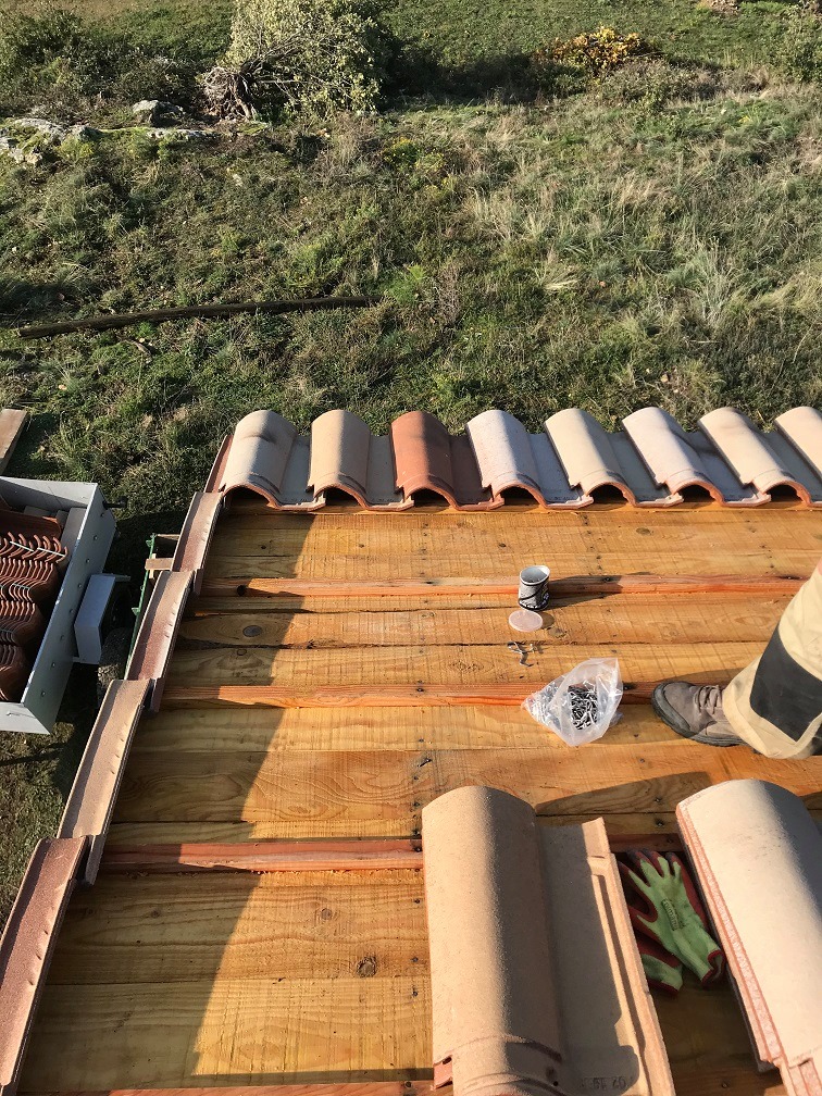 Les premiers travaux furent la pause de cinq pannes imposantes sur le faitage de ses murs. Ces pannes, récupérées lors du démontage du faux plafond de la vieille église Saint Pierre, ont été nettoyées, traitées et coupées sur mesure. Elles ont été installées par Georges, Michel, Christian, Raymond et Florian et constituent la charpente de la future toiture